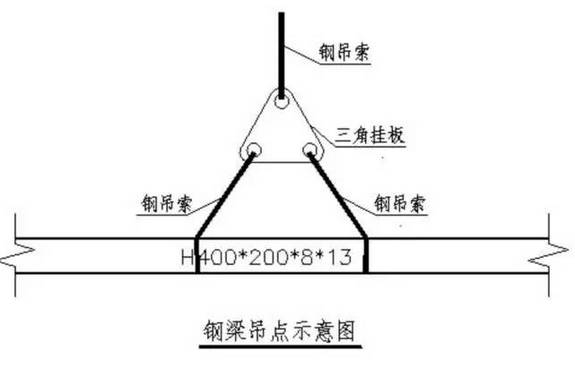 The lashing and hoisting points of steel beams are particularly important. Steel poles can be used when the steel beams are too long. There are many steel beams in this project with a maximum length of about 20m. A triangular hanging plate is used to enlarge the distance between the steel ropes to increase the angle of the steel ropes. Require. Schematic diagram of steel beam lashing.